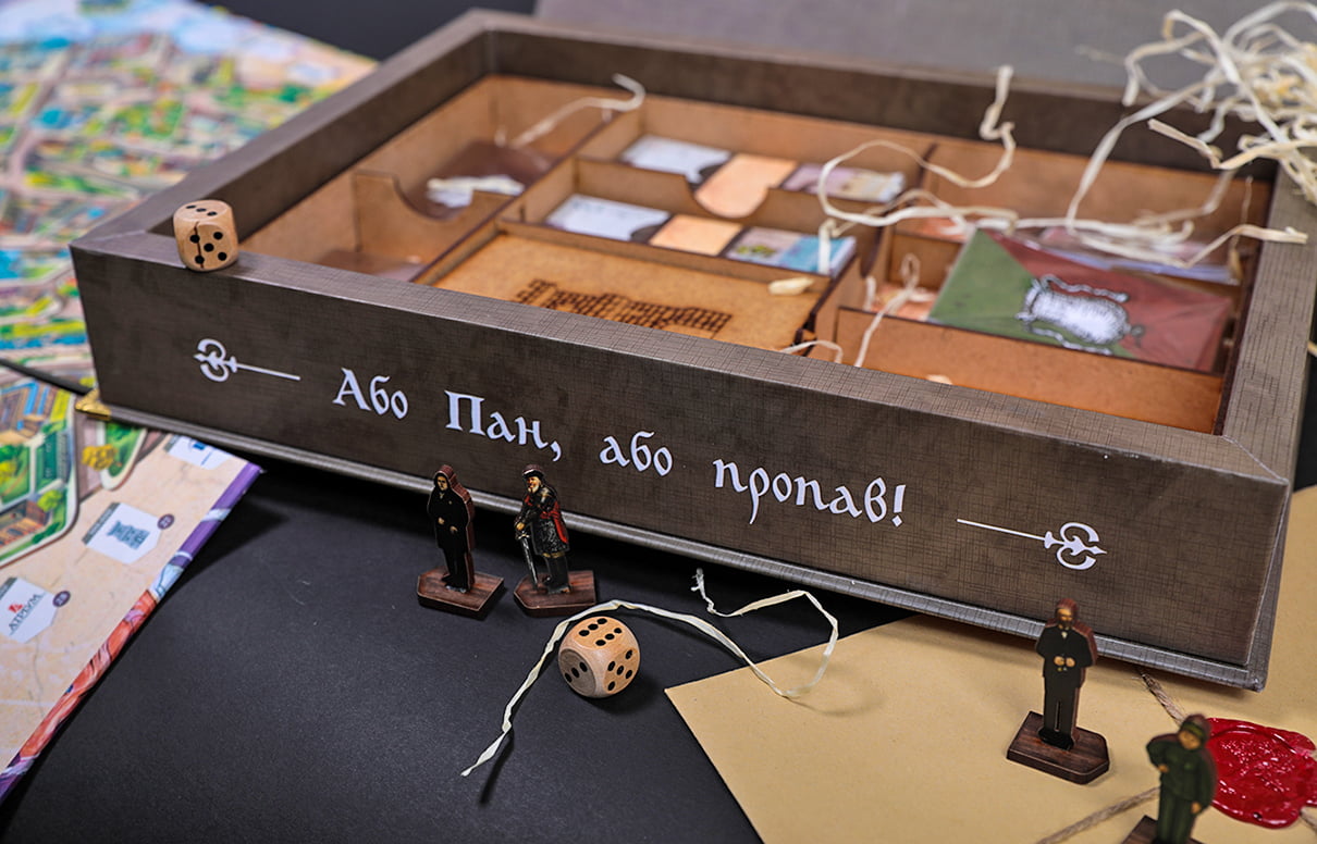 Упаковка з палітурного картону з обклейкою крейдованого паперу, якому перед тим ми надали структуру льону завдяки ембосуванню. Ігрове поле було отримане шляхом каширування крейдованого паперу палітурним картоном. Якісне рицювання картону забезпечило його ідеальне та компактне складання. Ігрові гроші надруковані на крафтовому папері, фактура якого додає гравцю відчуття справжності. Жетони і фішки зроблені по аналогічній технології виготовлення пазлів,а брошура інструкції надрукована на книжковому папері та зшита скобою. Приємно брати участь в реалізації таких проектів.