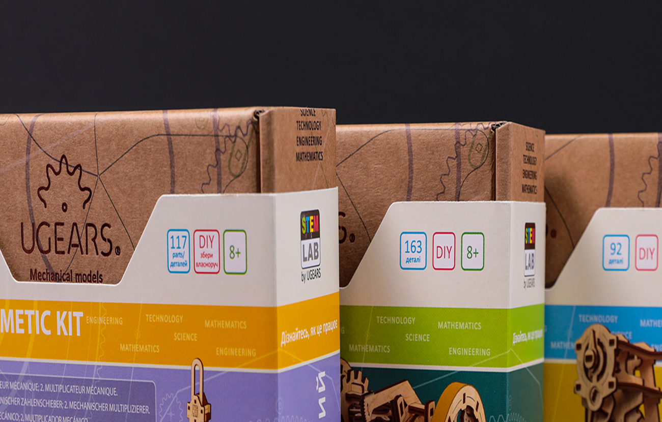 Виконали друк екологічної коробки для Української компанії «UGEARS», яка розробляє і виготовляє унікальні механічні 3D-пазли із спеціально підібраної фанери. Завдяки високоточній розробці та якості виробництва усі деталі легко складаються в готову модель без жодних інструментів і клею. Це відмінне поєднання природи і механіки, адже крім того, що всі моделі виготовлено з високоякісної фанери, майже кожна з них може рухатися, обертатися, гойдатися, або використовуватися як підставка – тримач.