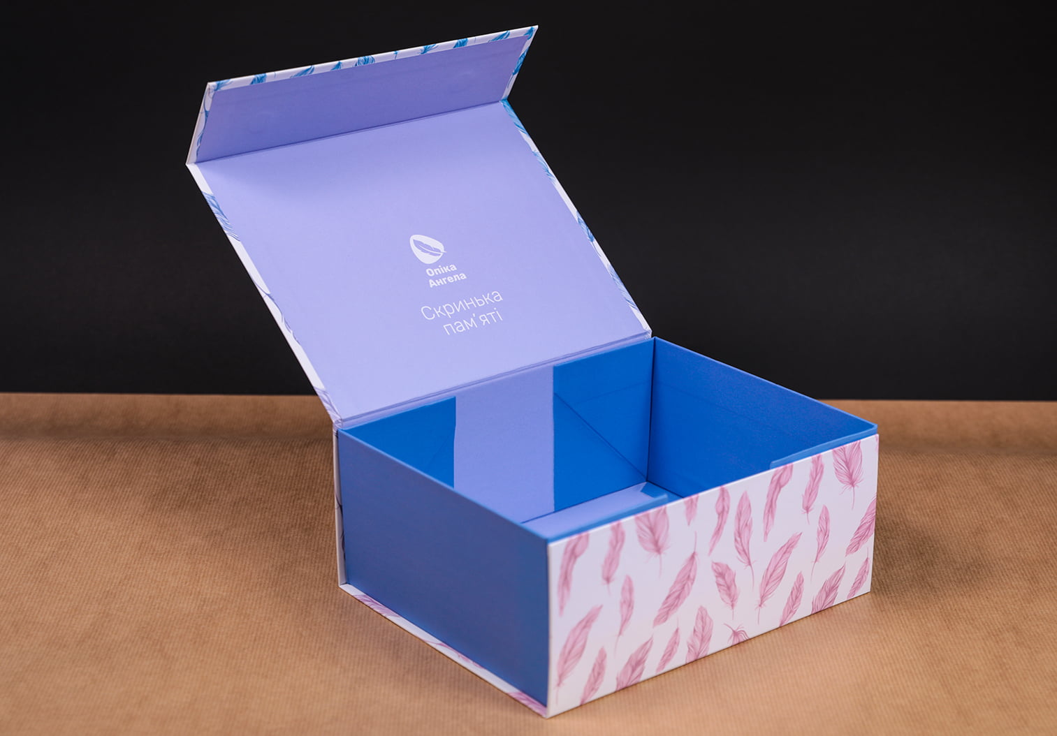 Ми дуже відповідально віднеслись до створення саме цієї коробки- трансформера та виготовили її з жорсткого палітурного картону. Для обклейки використаний крейдований папір, задрукований ніжними тонами та заламінований матовою плівкою. Вмонтовані магніти забезпечують бездоганне закривання.